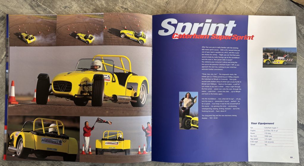 “Three, two, one, Go!” The stopwatch starts, the wheels spin as 175bhp powering just 540kg catapults the Caterham to 50mph in 4 seconds. Now grab second with another chirp of wheel spin as you hurtle to 80mph and 7000rpm. Hard on the brakes a puff of tyre smoke as you lock a wheel… keep it tight through the first corner… power out, onto the next, through the slalom… grab third… correct the slide… up to 90mph and hard on the brakes again.